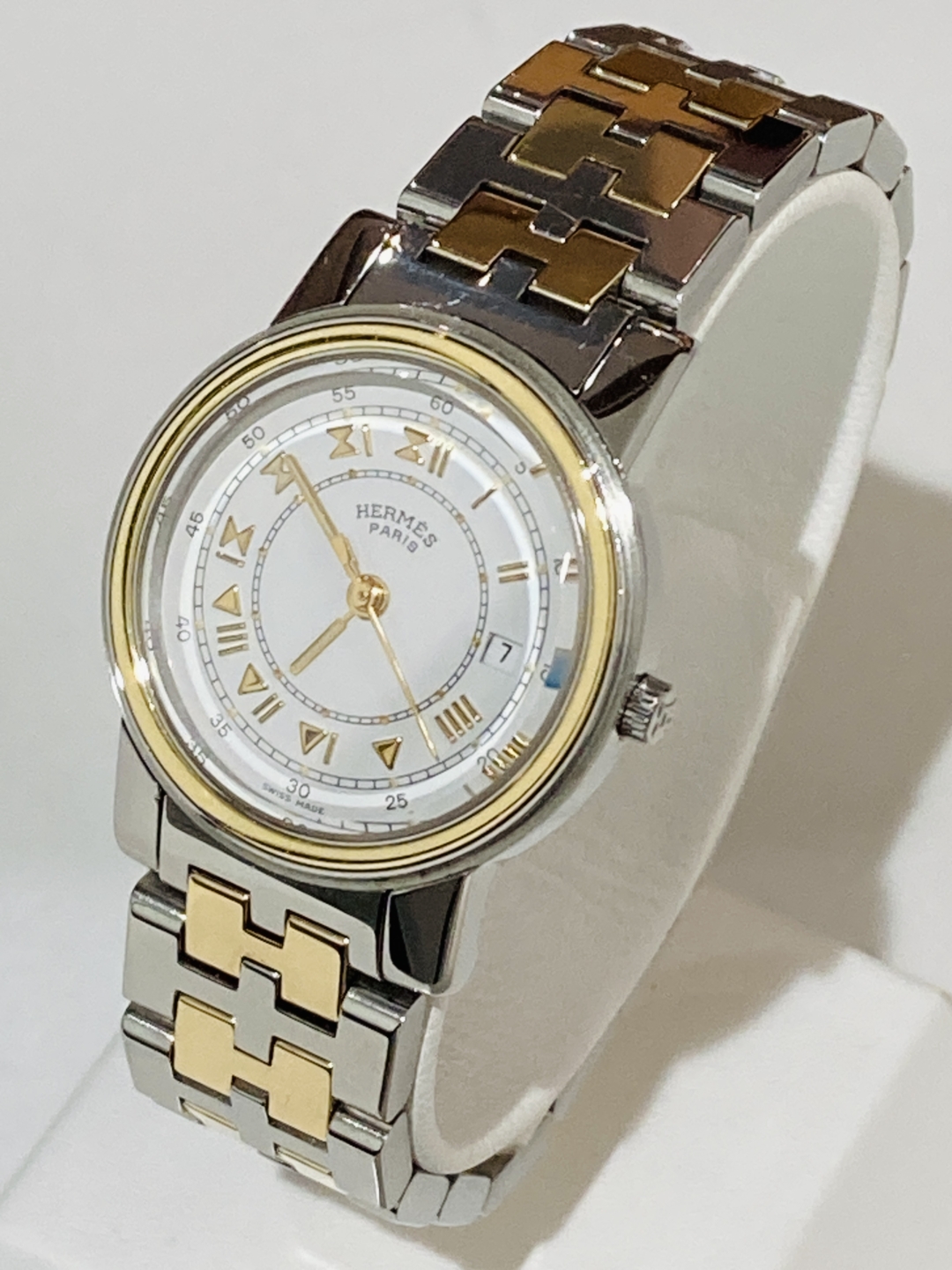 今回お預かりしたのは、Hermès(エルメス)キャリック コンビモデル。ゴールドとシルバーのコンビブレスレットが上品な、エルメスらしいエレガントな一本です。